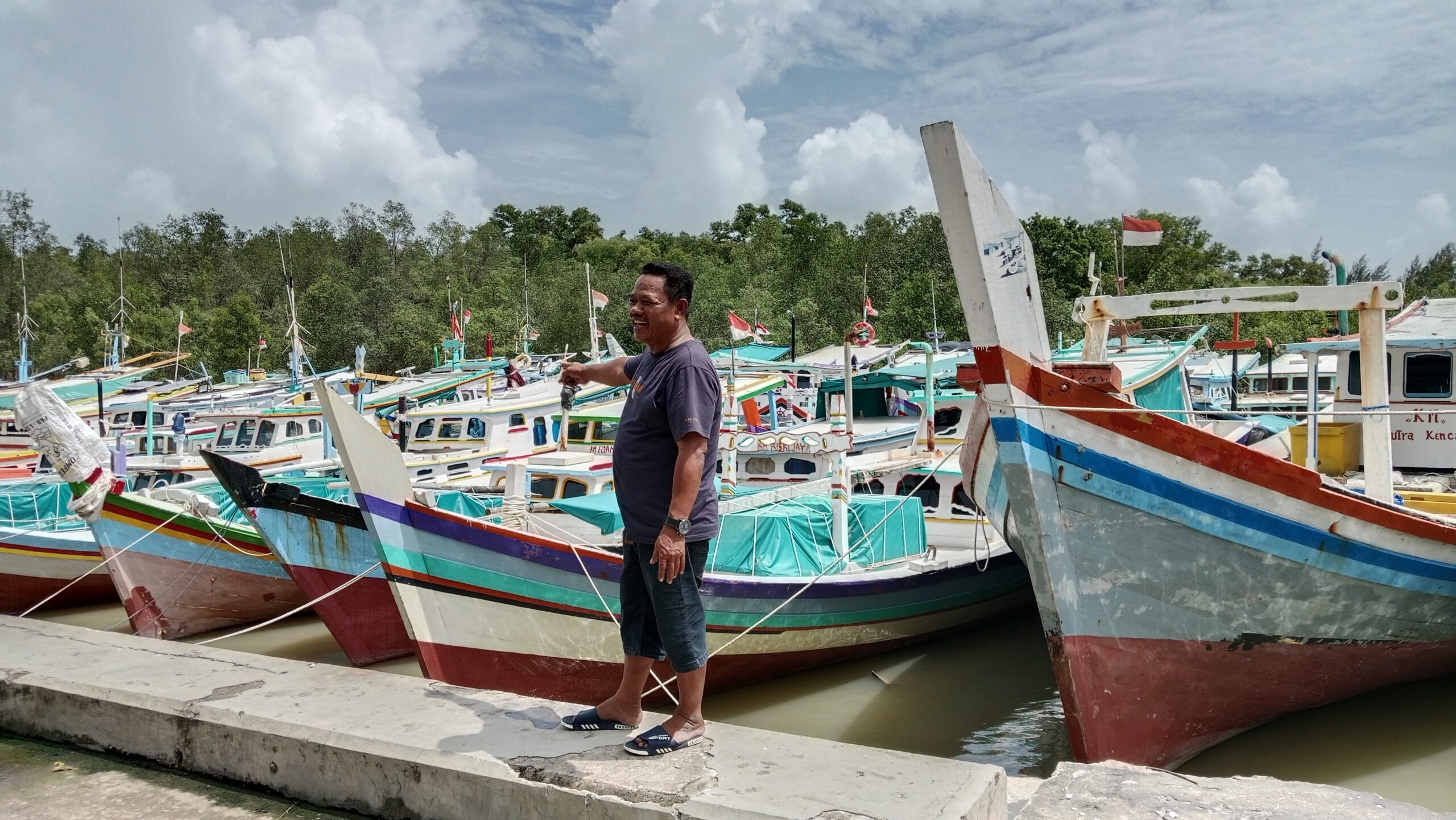 Albar menunjukkan ratusan perahu nelayan yang sandar di Dermaga PPN Sungailiat, Kamis (9/1). (Foto: Romlan)