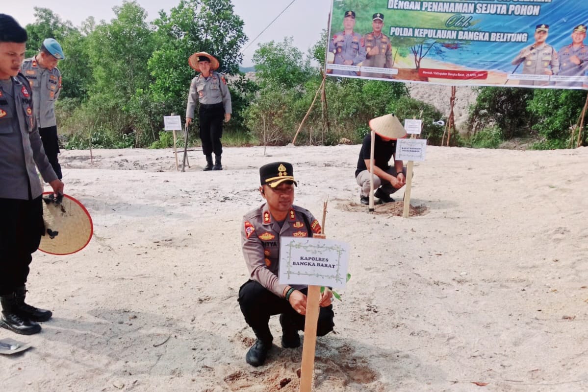 BANGKABARAT – Dukung Program Ketahanan Bumi, Polres Bangka Barat bersama Pemerintah Desa Air Putih mengajak masyarakat dan pelajar tanam 200 bibit pohon jambu mente dan 100 bibit cemara di lahan eks tambang, Selasa (29/4/2025).