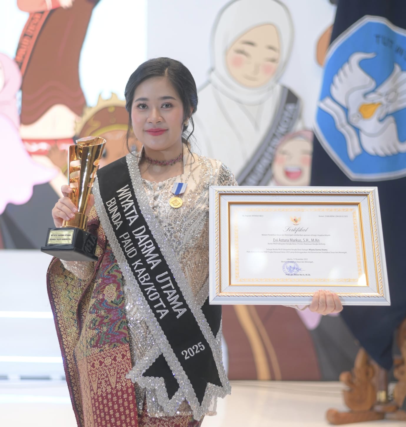 BANGKA BARAT – Bunda PAUD Kabupaten Bangka Barat, Evi Astura, Markus mendapat penghargaan level nasional Bunda PAUD terbaik kategori tertinggi Wiyata Darma Utama dari Kementerian Pendidikan Dasar dan Menengah (Kemendikdasmen).
