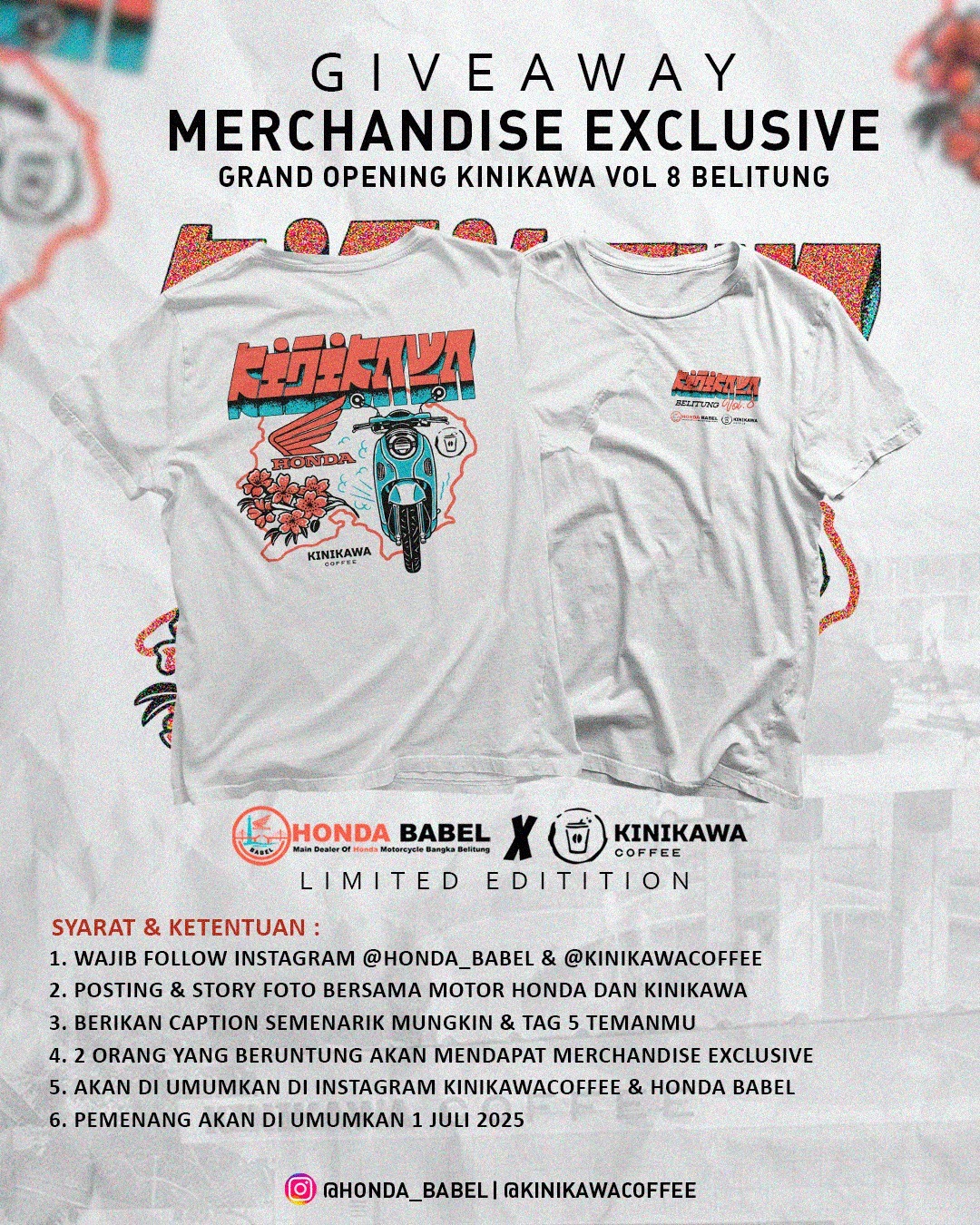 Informasi lebih lanjut mengenai cara mengikuti giveaway dapat dicek langsung melalui akun Instagram resmi Kinikawa (@kinikawacoffee) dan Honda Babel (@honda_babel).