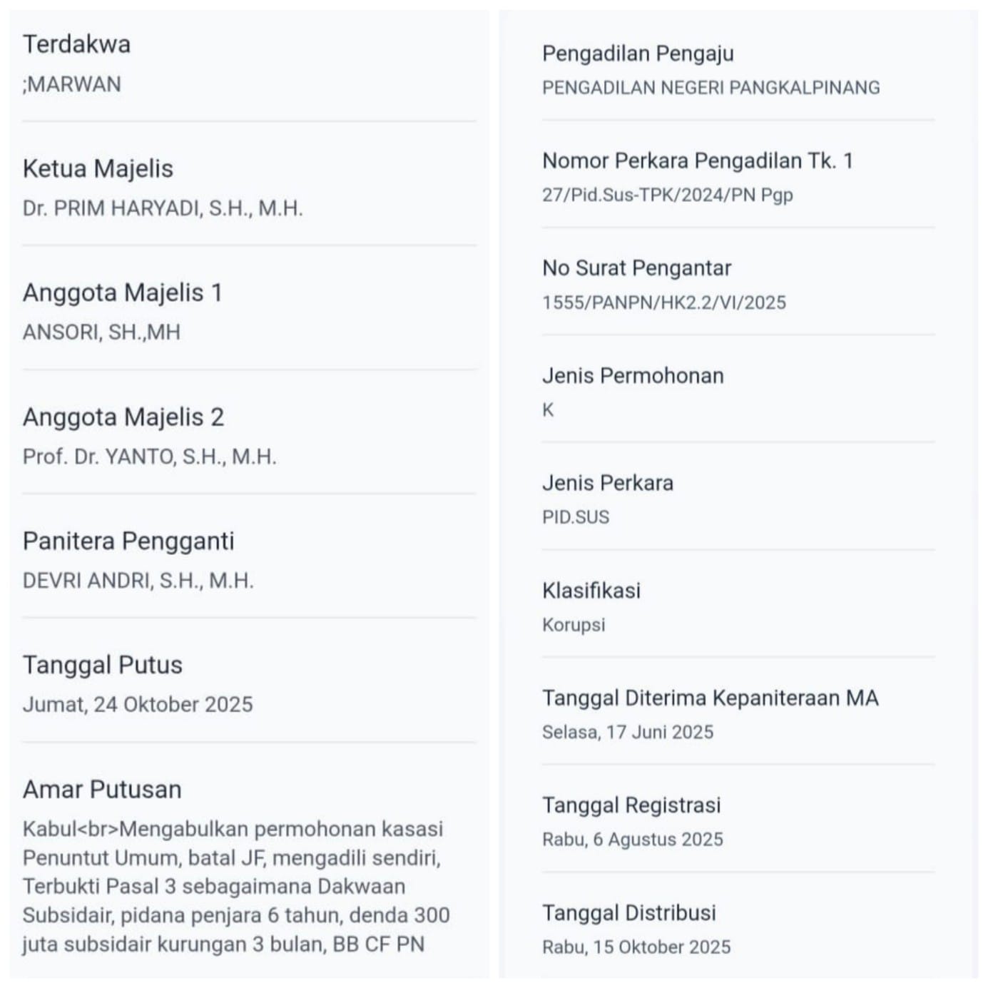 Putusan Nomor 9117 K/PID.SUS/2025 tertanggal 24 Oktober 2025, membatalkan vonis bebas yang sebelumnya diterima Marwan pada 30 April 2025.