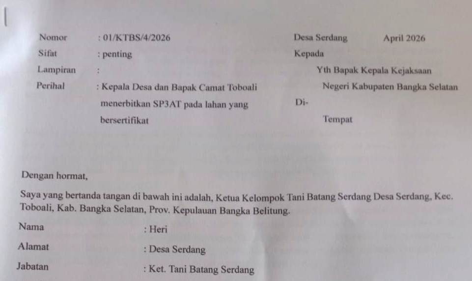 Laporan tersebut disampaikan melalui surat resmi bernomor 01/KTBS/4/2026 tertanggal April 2026, yang ditujukan kepada Kepala Kejari Bangka Selatan.