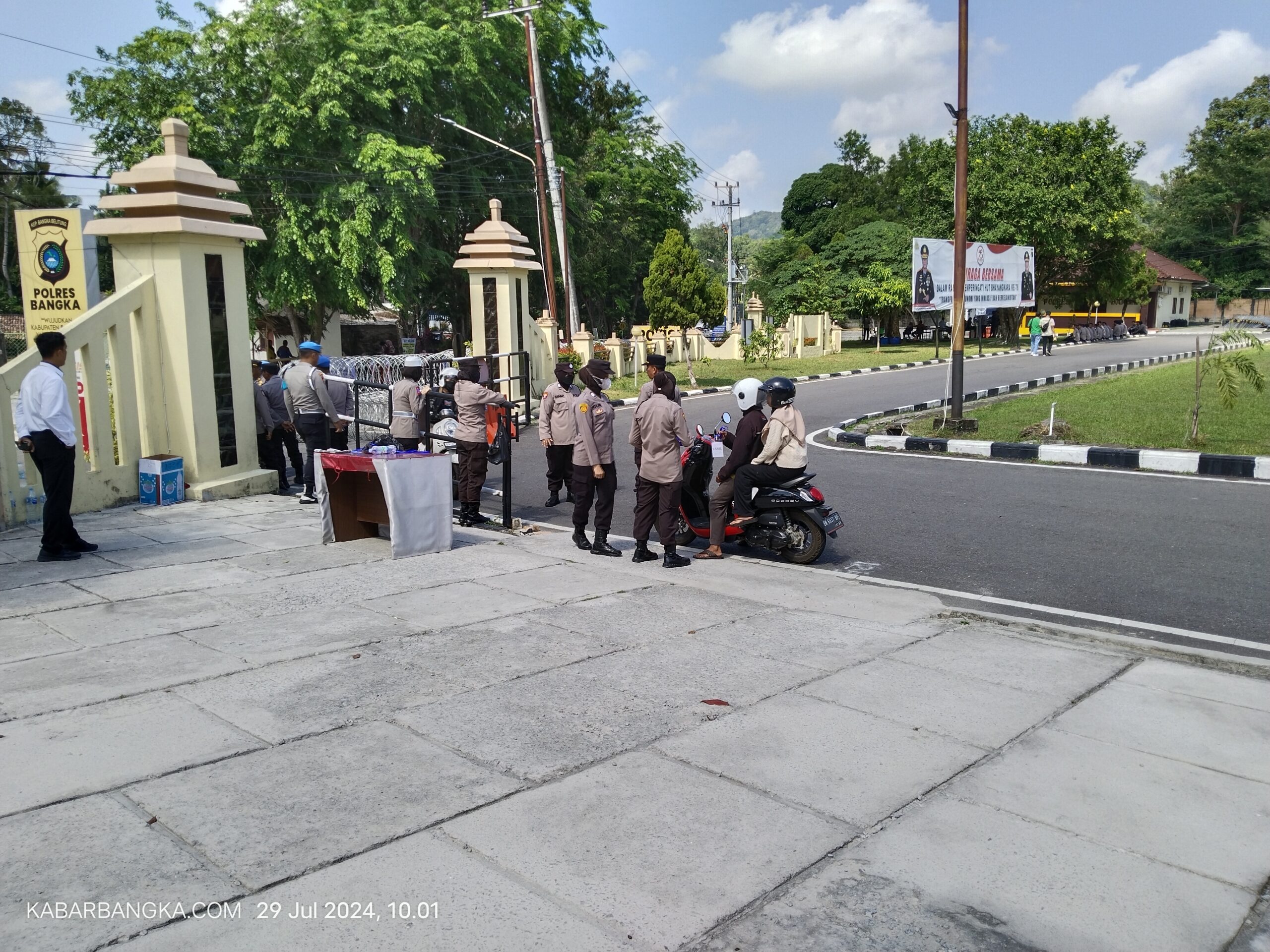 Pantauan kabarbangka.com di Mapolres Bangka, nampak aksi unjuk rasa mendapat pengawalan dan pengamanan ketat dari personel Polres Bangka, BKO Samapta Polda Babel dan Kompi A Brimob Polda Babel. (Romlan)
