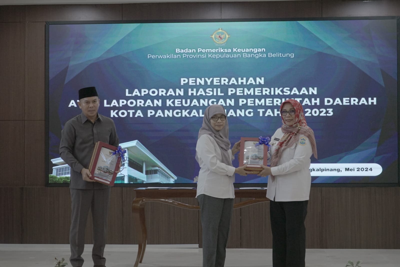 Penyerahan laporan hasil pemeriksaan atas Laporan Keuangan Pemerintah Daerah Kota Pangkalpinang tahun 2023 dilaksanakan di Auditorium Kantor BPK Perwakilan Provinsi Bangka Belitung, Rabu (29/05/2024).