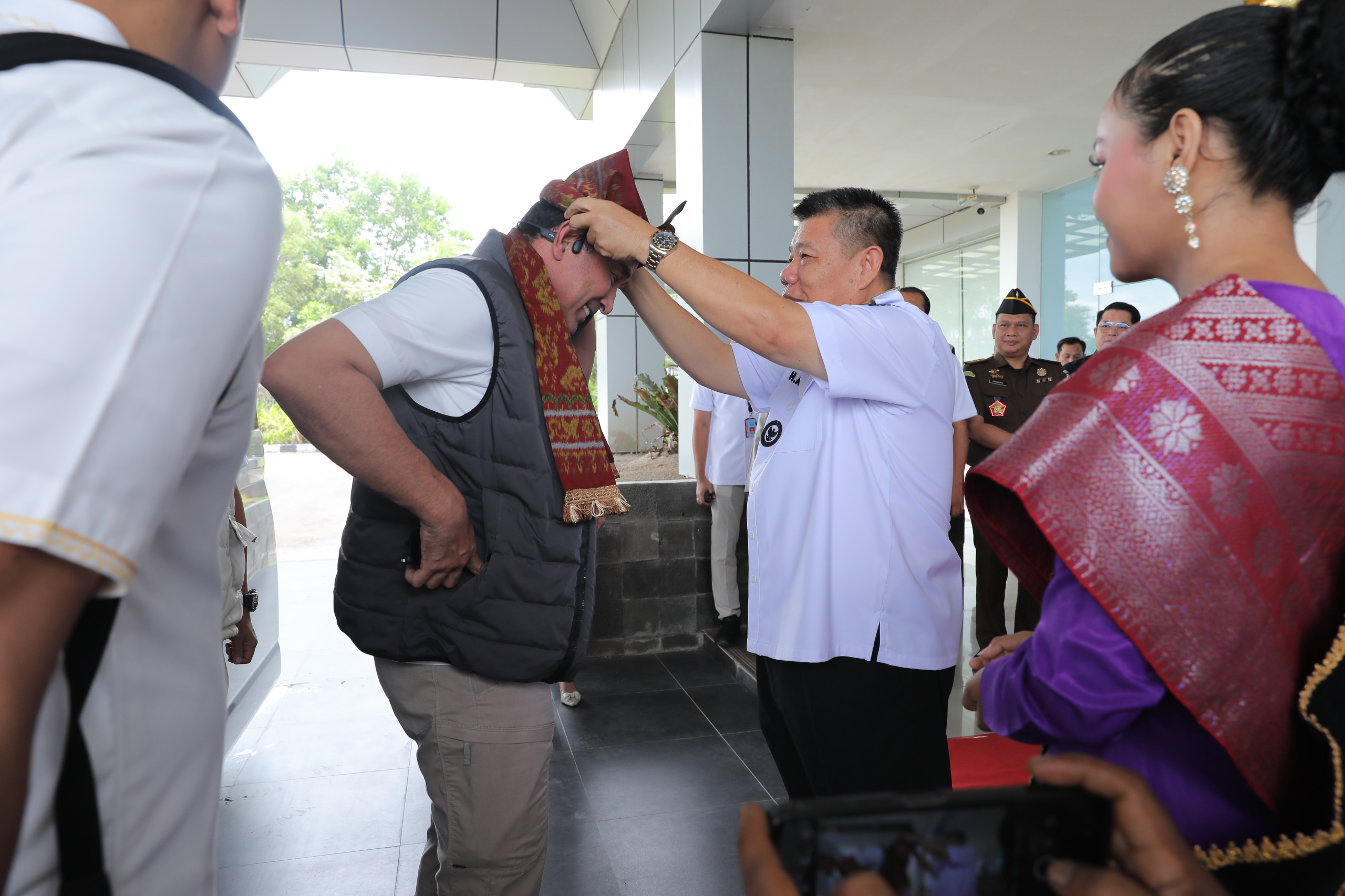 Prosesi penyambutan diwarnai dengan tradisi lokal berupa pemasangan topi dan syal cual khas Bangka Belitung sebagai bentuk penghormatan.