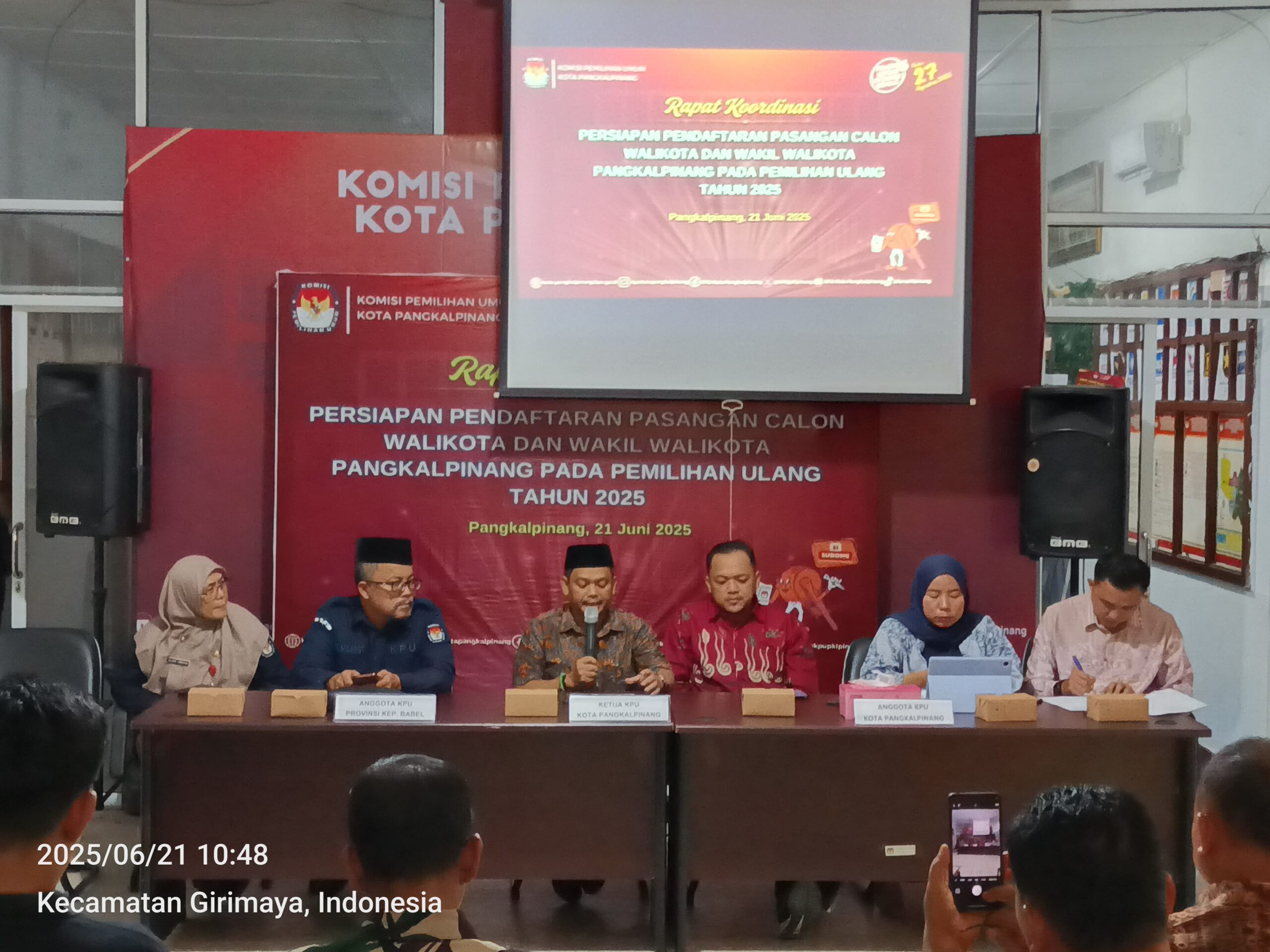 Penegasan itu disampaikan Akhmad Subekti saat menghadiri rapat koordinasi persiapan pendaftaran pasangan calon Pilkada Ulang yang digelar di Sekretariat Komisi Pemilihan Umum Kota Pangkalpinang, Sabtu (21/6/2025).