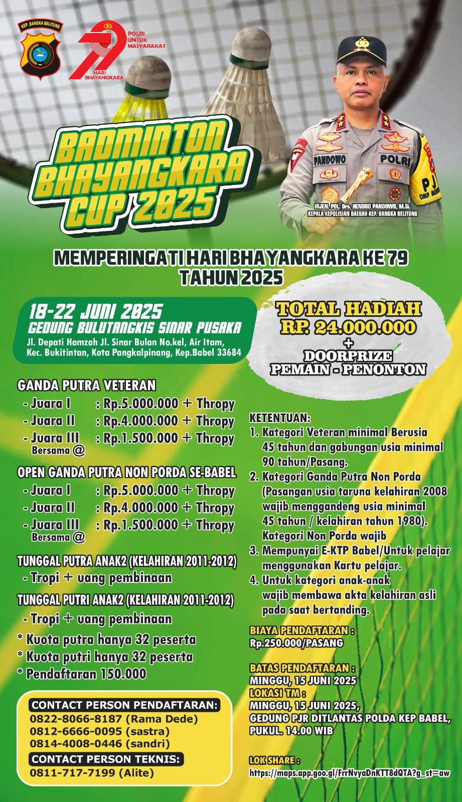 “Pelaksanaannya nanti 5 hari dari tanggal 18 Juni dan rencana akan dibuka langsung oleh Pak Kapolda Irjen Pol Hendro Pandowo di Gedung Bulutangkis Sinar Pusaka Pangkalpinang,” kata Hendra, Kamis (12/6/25).