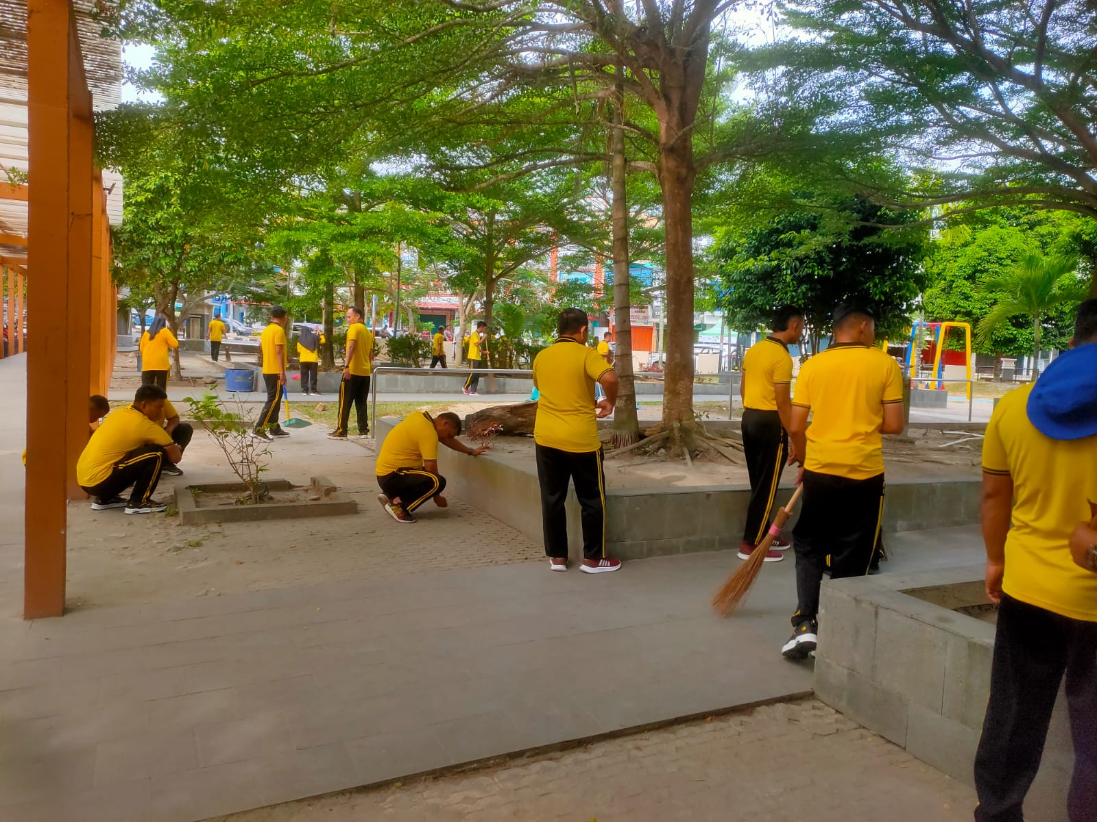 Kegiatan yang dilaksanakan pada pagi hari tersebut difokuskan pada pembersihan sampah di sekitar taman, pemangkasan rumput liar, serta penataan area fasilitas umum yang sering dimanfaatkan masyarakat untuk berolahraga dan bersantai.
