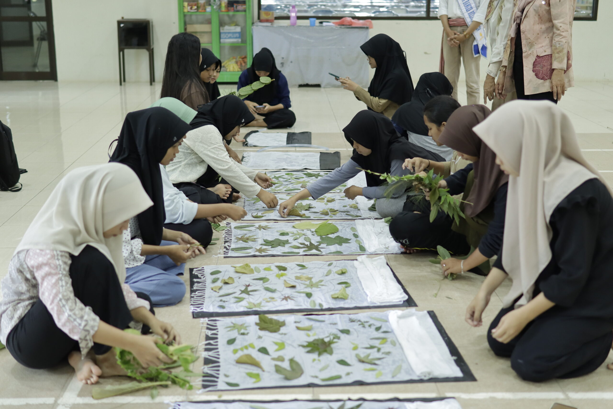 Para siswa juga antusias mempraktikkan membuat batik ecoprint dengan memanfaatkan dedauan untuk dijadikan motif. Semuanya mengikuti proses yang dicontohkan untuk menghasilkan kain batik yang indah.