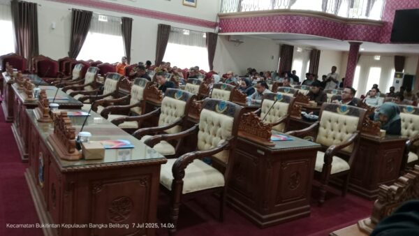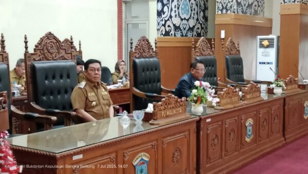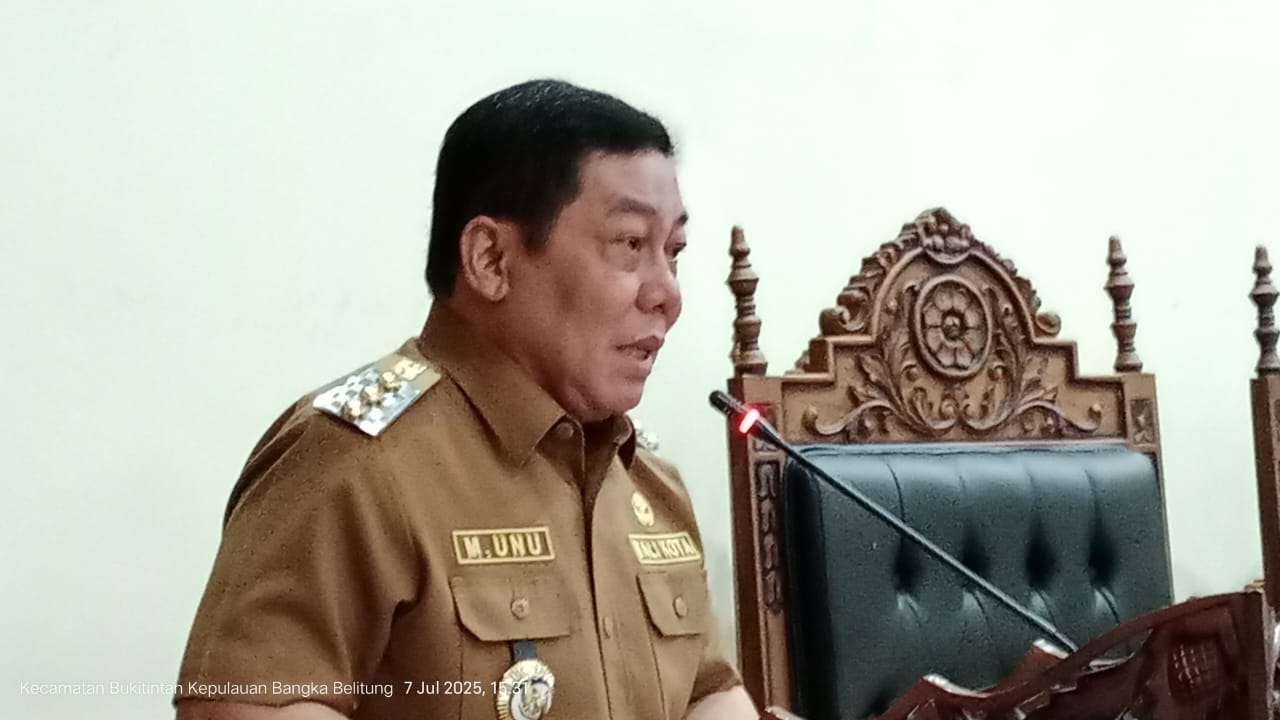 PANGKALPINANG – Penjabat Wali Kota Pangkalpinang, Muhammad Unu Ibnudin, menyampaikan pidato dalam rapat paripurna DPRD Kota Pangkalpinang, Senin (7/7/2025).