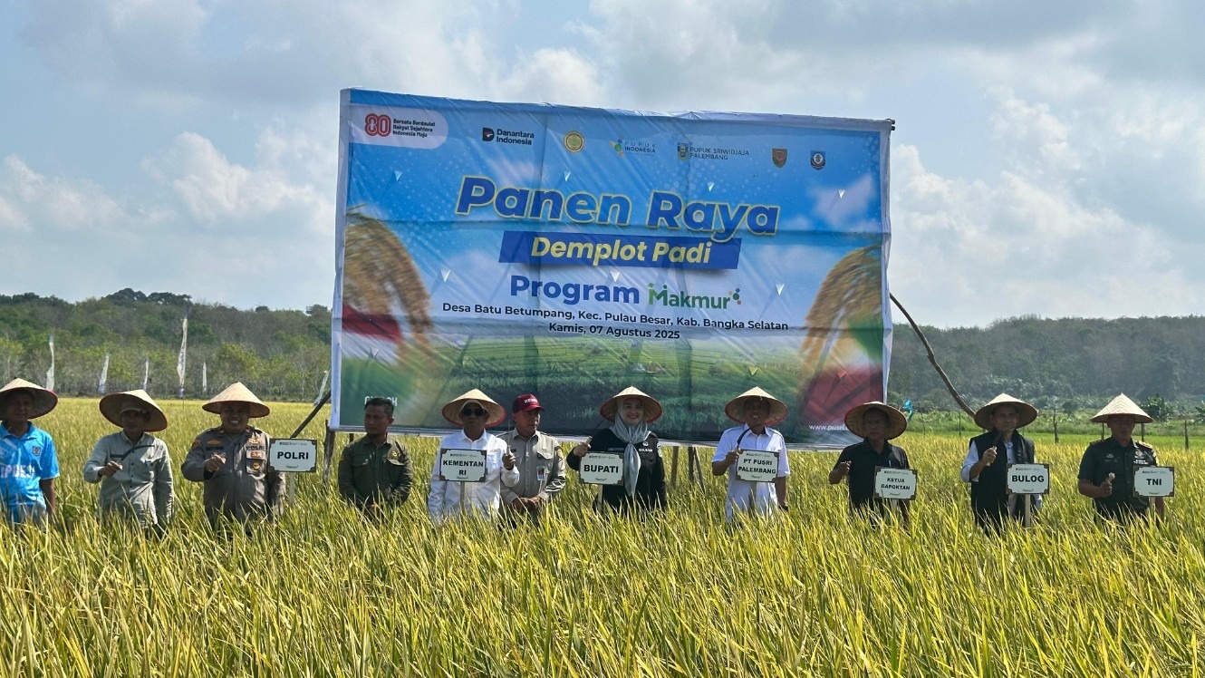BANGKA SELATAN – Pemerintah Kabupaten Bangka Selatan bersama PT Pupuk Sriwidjaja Palembang (Pusri) menggelar Panen Raya Demplot Padi Program Makmur di Desa Batu Betumpang, Kecamatan Pulau Besar, Kamis (7/8/2025).